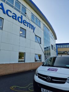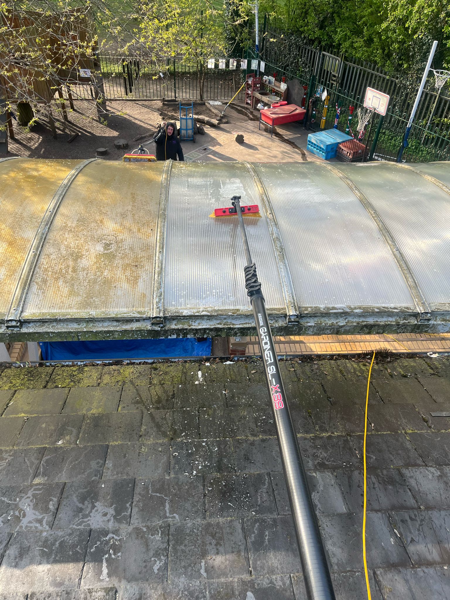 When it comes to schools, safety always comes first. Professional cleaners use eco-friendly, non-toxic cleaning solutions that are safe for children and staff. For upper-floor windows, water-fed poles and purified water systems are commonly used — reducing the need for ladders and minimising risk.